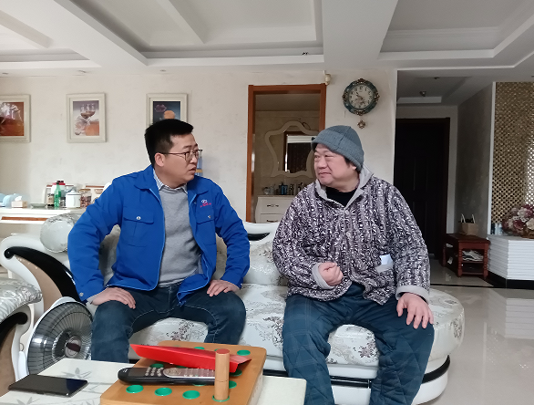 在南齿社区,徐华君总经理接连走访了居住于此的三位职工。在退伍军人郭文华家中,他仔细询问了他髋关节置换手术后的恢复情况,鼓励其保持积极心态,坚持科学适度的康复训练。在文素峰家中,总经理关切地提醒他要多下楼活动,多与家人沟通交流,持续锻炼语言与思维能力。
